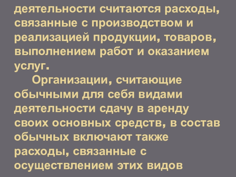 с производством и реализацией продукции, товаров, выполнением работ и оказанием услуг. Организации, считающие обычными для себя видами деятельности сдачу в аренду своих основных средств, в состав обычных включают также расходы, связанные с осуществлением этих видов деятельности.