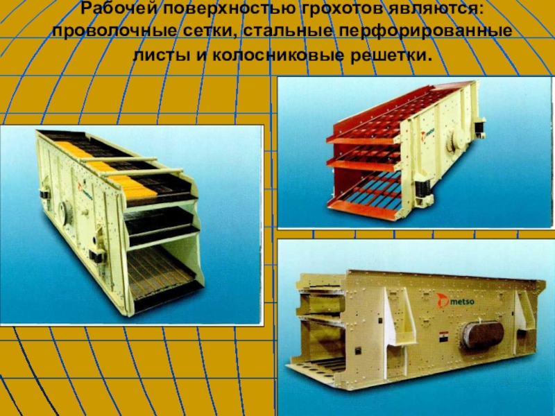 Слайд 32Рабочей поверхностью грохотов являются: проволочные сетки, стальные перфорированные листы и колосниковые