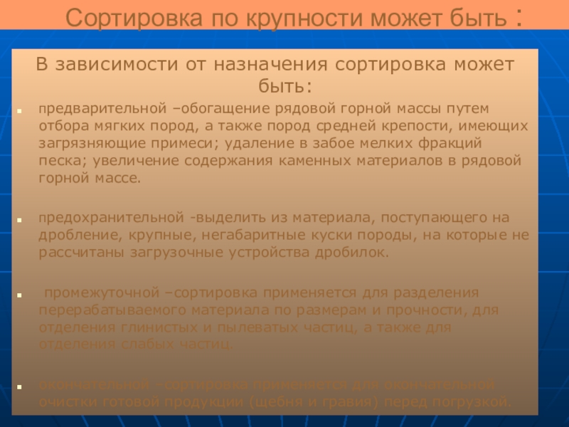 промежуточной –сортировка применяется для разделения перерабатываемого материала по размерам и прочности, для отделения глинистых и пылеватых частиц, а также для отделения слабых частиц.