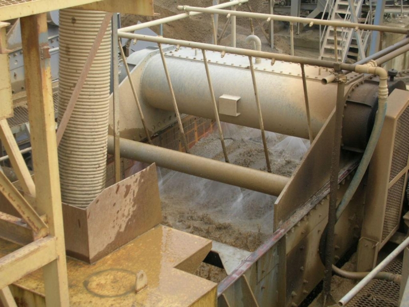 от глинистой и пылевидной составляющей. Вращающийся барабан промывочной установки разделён на две секции, в каждой из которых происходит движение и перемешивание материала под напором воды в соответствии с запатентованной технологией BAIONI. Барабан может изменять угол наклона и регулировать уровень и напор воды для промывки. Такие установки применяются в различных комплексах промывки.