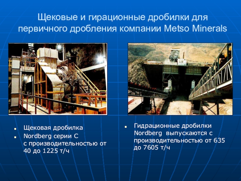 Слайд 14Щековые и гирационные дробилки для первичного дробления компании Metso Minerals