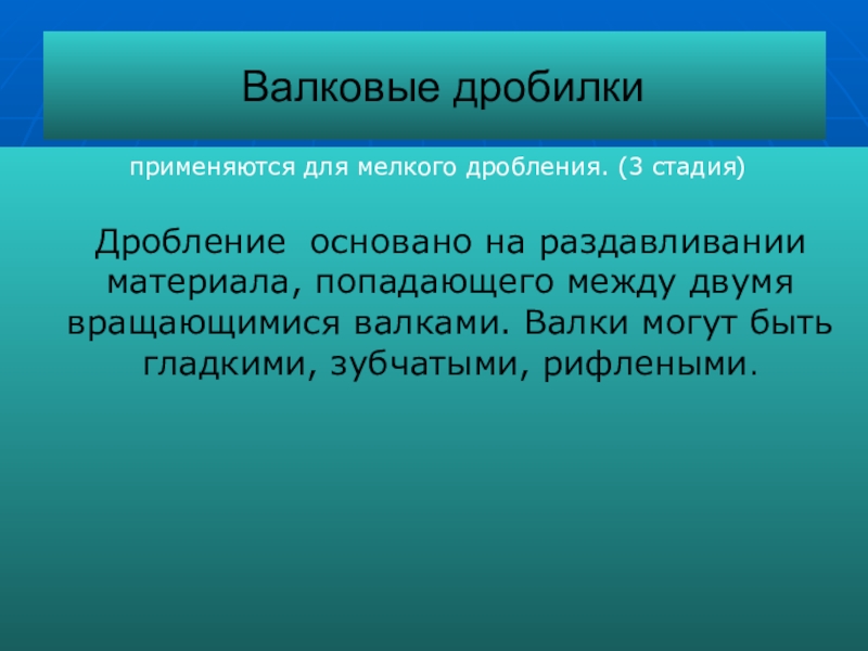 на раздавливании материала, попадающего между двумя вращающимися валками. Валки могут быть гладкими, зубчатыми, рифлеными.