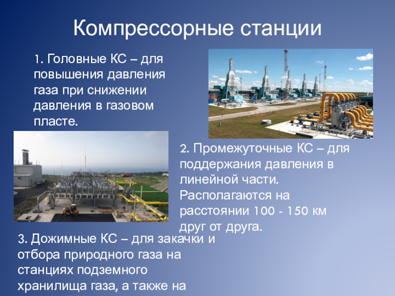 2. Промежуточные КС – для поддержания давления в линейной части. Располагаются на расстоянии 100 - 150 км друг от друга.