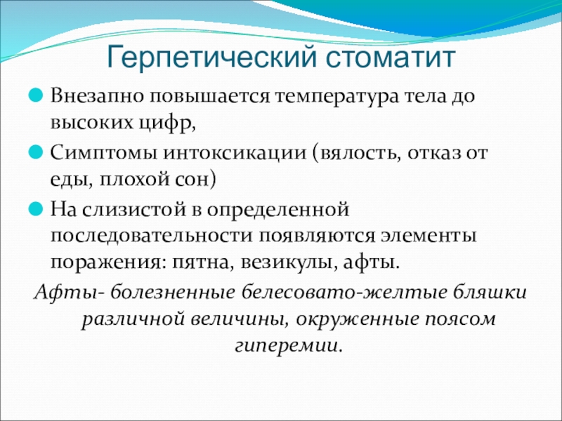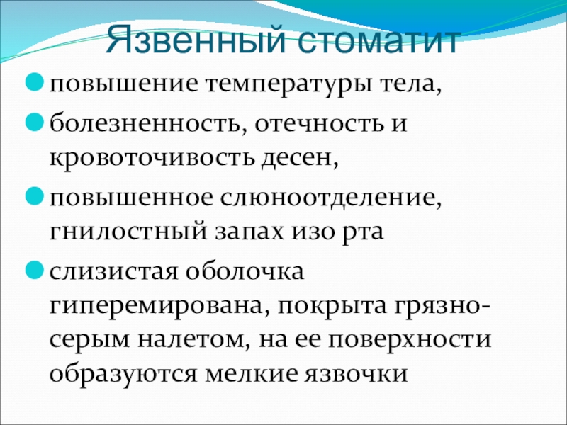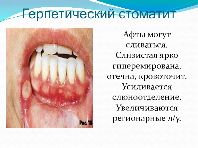 Афты могут сливаться. Слизистая ярко гиперемирована, отечна, кровоточит. Усиливается слюноотделение.