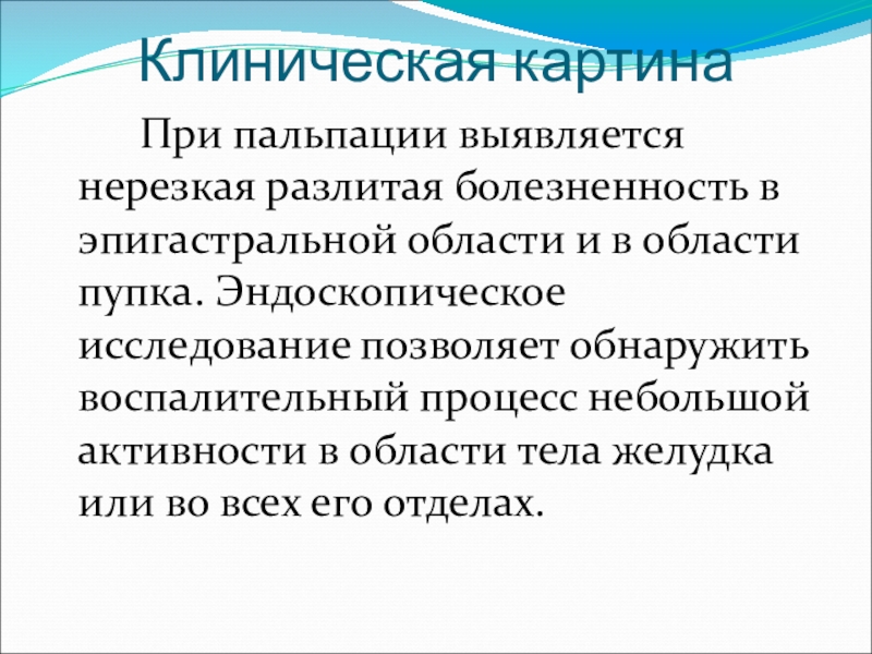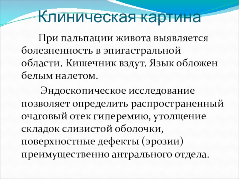 При пальпации выявляется нерезкая разлитая болезненность в эпигастральной области и
