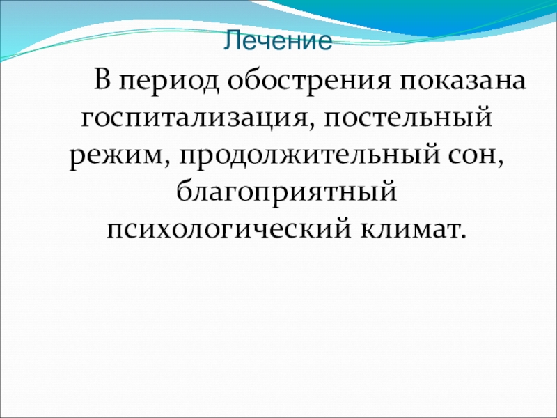 В период обострения показана госпитализация, постельный режим, продолжительный сон, благоприятный психологический