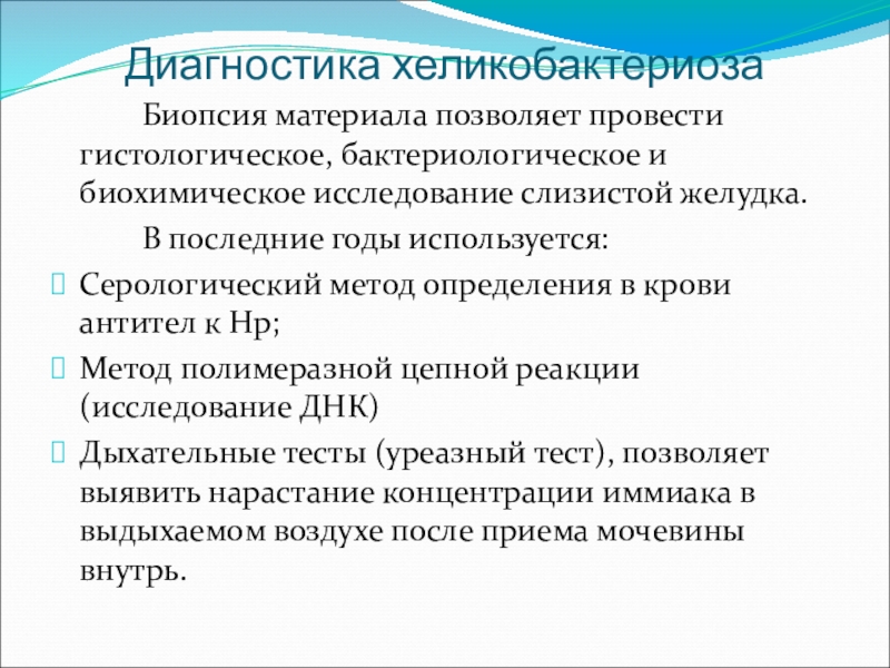 Дыхательные тесты (уреазный тест), позволяет выявить нарастание концентрации иммиака в выдыхаемом воздухе после приема мочевины внутрь.