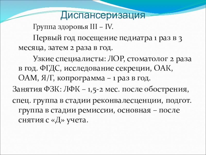 Узкие специалисты: ЛОР, стоматолог 2 раза в год. ФГДС, исследование секреции, ОАК, ОАМ, Я/Г, копрограмма – 1 раз в год.