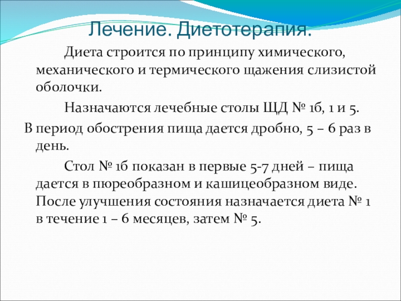 Стол № 1б показан в первые 5-7 дней – пища дается в пюреобразном и кашицеобразном виде. После улучшения состояния назначается диета № 1 в течение 1 – 6 месяцев, затем № 5.