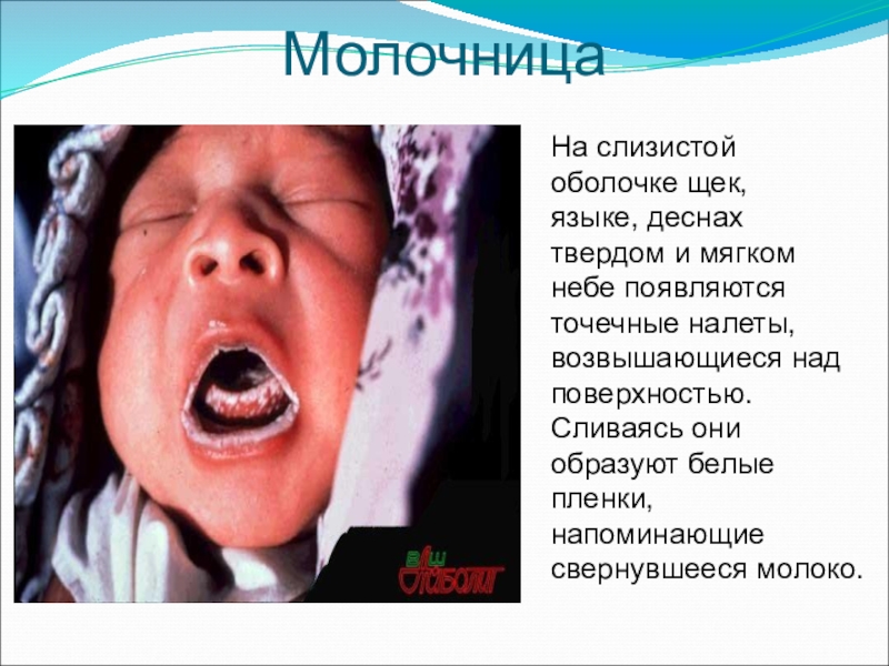 точечные налеты, возвышающиеся над поверхностью. Сливаясь они образуют белые пленки, напоминающие свернувшееся молоко.