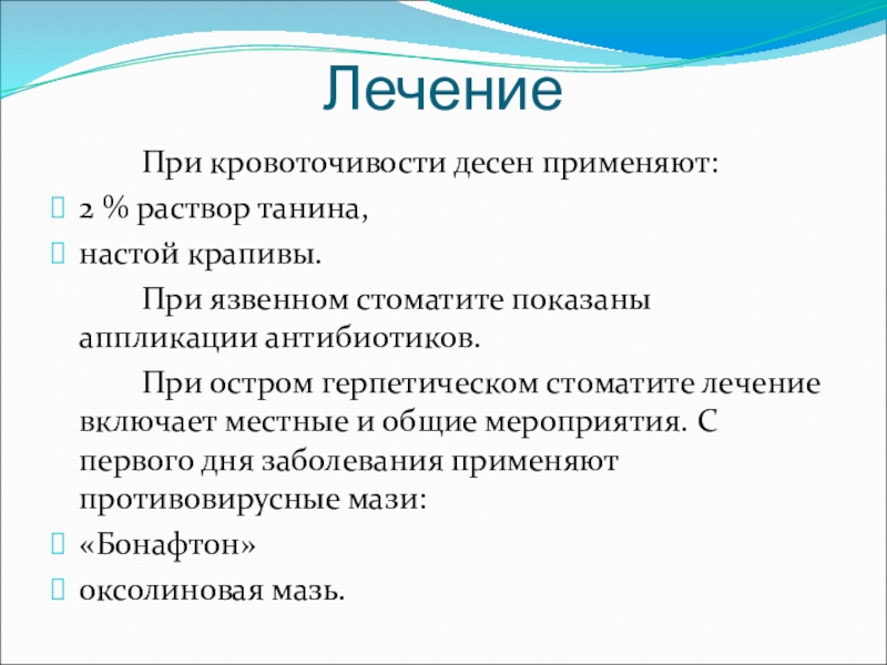 При остром герпетическом стоматите лечение включает местные и общие мероприятия. С первого дня заболевания применяют противовирусные мази: