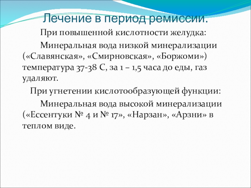 «Смирновская», «Боржоми») температура 37-38 С, за 1 – 1,5 часа до еды, газ удаляют.