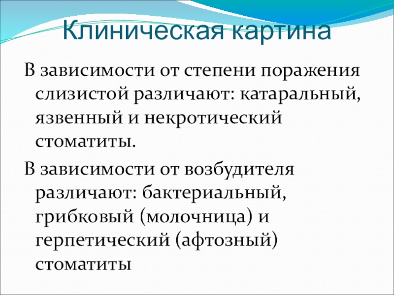 В зависимости от возбудителя различают: бактериальный, грибковый (молочница) и герпетический (афтозный) стоматиты