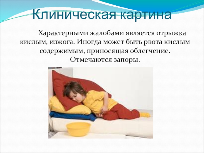 Характерными жалобами является отрыжка кислым, изжога. Иногда может быть рвота