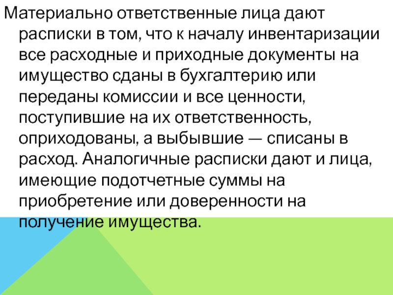 Слайд 6Материально ответственные лица дают расписки в том, что к началу инвентаризации