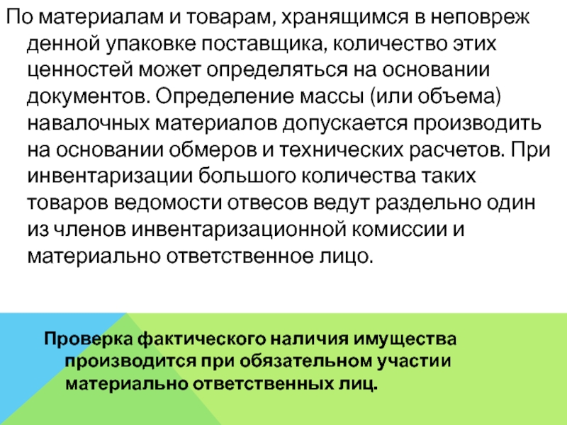 Слайд 9По материалам и товарам, хранящимся в неповрежденной упаковке поставщика, количество этих
