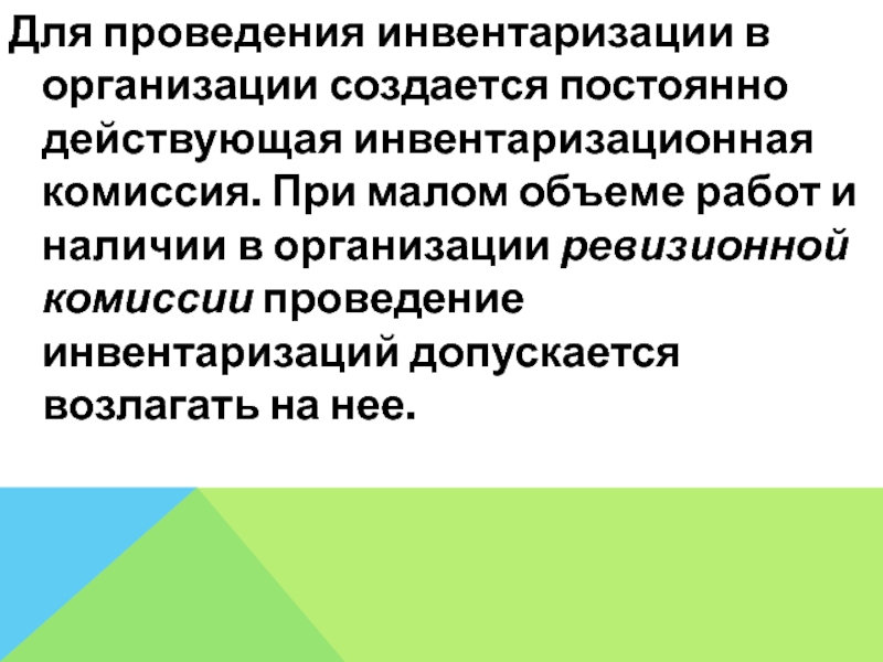 Слайд 2Для проведения инвентаризации в организации создается постоянно действующая инвентаризационная комиссия. При