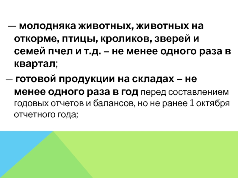 — готовой продукции на складах – не менее одного раза в год перед составлением годовых отчетов и балансов, но не ранее 1 октября отчетного года;