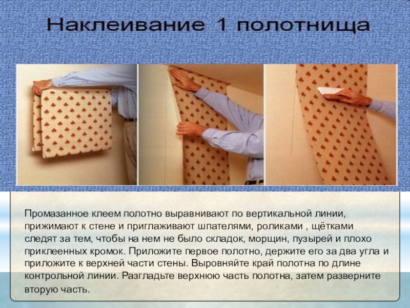 Слайд 17Промазанное клеем полотно выравнивают по вертикальной линии, прижимают к стене и