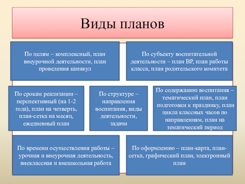 По срокам реализации – перспективный (на 1-2 года), план на четверть, план-сетка на месяц, ежедневный план