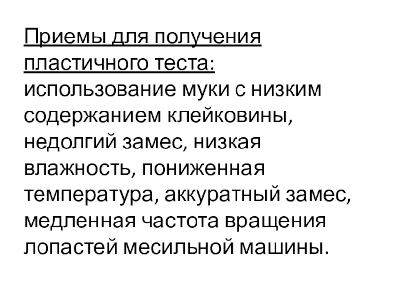 Слайд 13Приемы для получения пластичного теста: использование муки с низким содержанием клейковины,