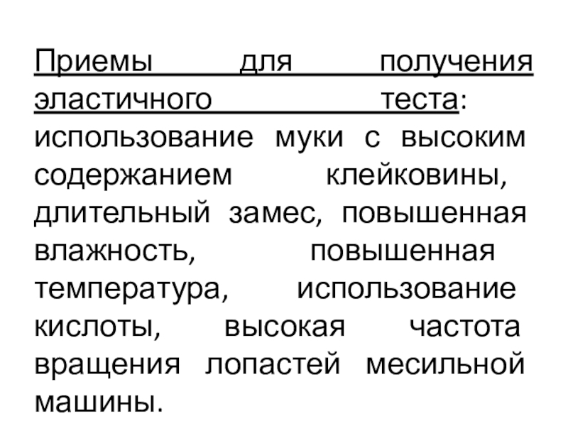 Слайд 12Приемы для получения эластичного теста: использование муки с высоким содержанием клейковины,