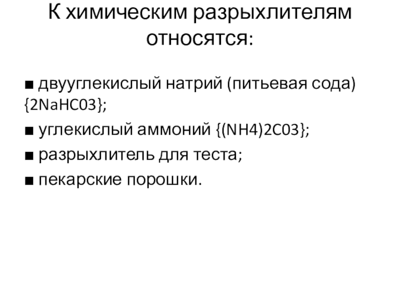 Химические разрыхлители представляют собой порошки, которые при выпечке (нагревании) при температуре 65 — 70 °С расщепляются с