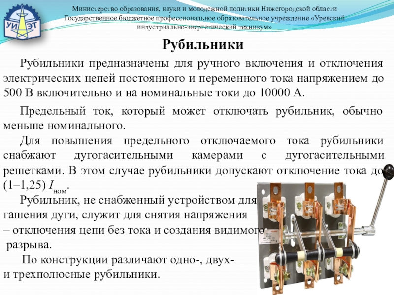 Предельный ток, который может отключать рубильник, обычно меньше номинального.