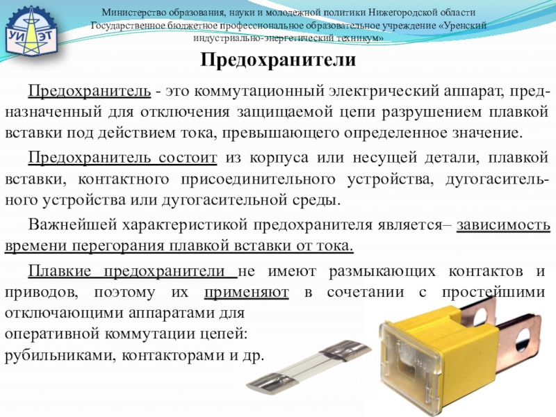 Предохранитель - это коммутационный электрический аппарат, пред-назначенный для отключения защищаемой цепи разрушением плавкой вставки под действием тока, превышающего определенное значение.