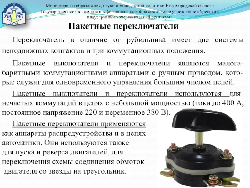 Пакетные выключатели и переключатели используются для нечастых коммутаций в цепях с небольшой мощностью (токи до 400 А, постоянное напряжение 220 и переменное 380 В).