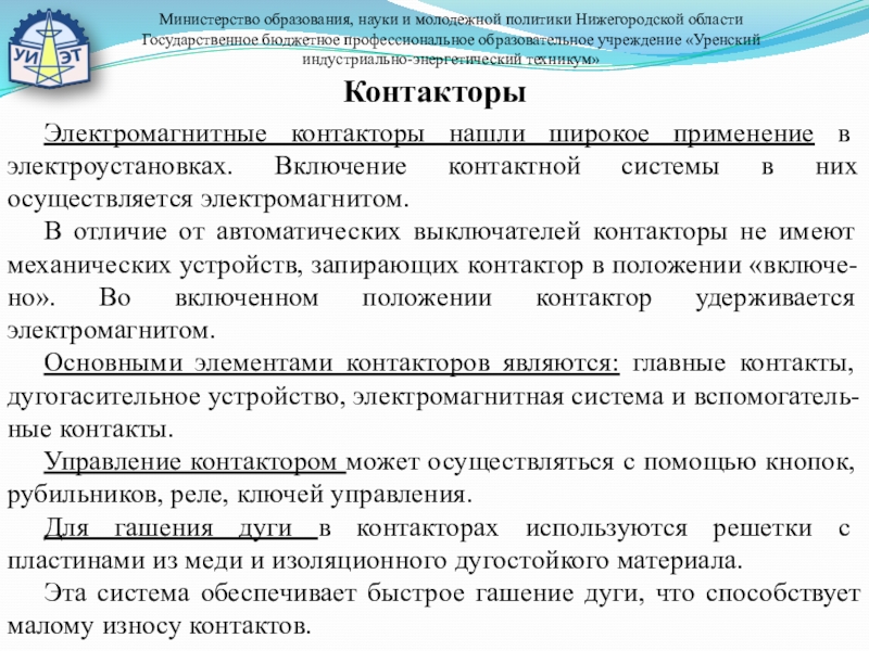 Электромагнитные контакторы нашли широкое применение в электроустановках. Включение контактной системы в них осуществляется электромагнитом.