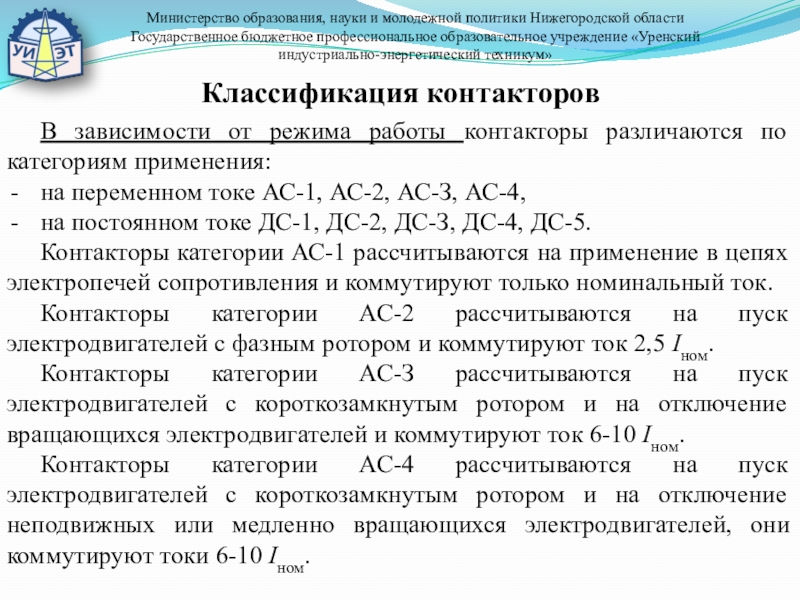 В зависимости от режима работы контакторы различаются по категориям применения: