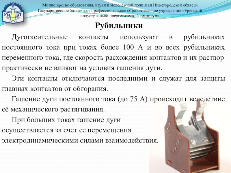 Эти контакты отключаются последними и служат для защиты главных контактов от обгорания.