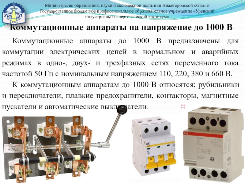 Коммутационные аппараты до 1000 В предназначены для коммутации электрических цепей в нормальном и аварийных режимах в одно-, двух- и трехфазных сетях переменного тока частотой 50 Гц с номинальным напряжением 110, 220, 380 и 660 В.