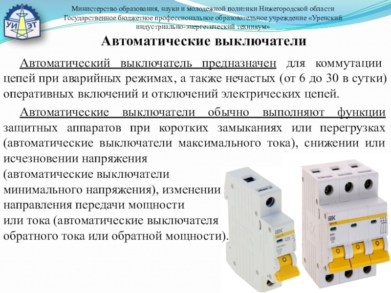 Автоматические выключатели обычно выполняют функции защитных аппаратов при коротких замыканиях или перегрузках (автоматические выключатели максимального тока), снижении или исчезновении напряжения
