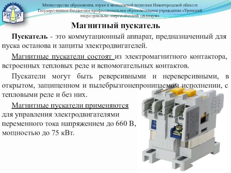 Пускатель - это коммутационный аппарат, предназначенный для пуска останова и защиты электродвигателей.