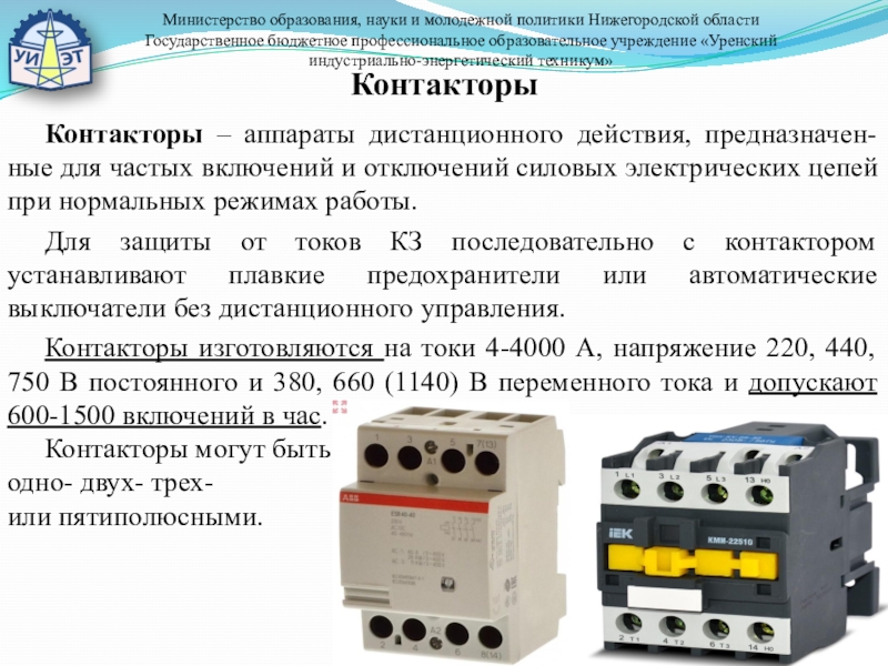 Контакторы изготовляются на токи 4-4000 А, напряжение 220, 440, 750 В постоянного и 380, 660 (1140) В переменного тока и допускают 600-1500 включений в час.