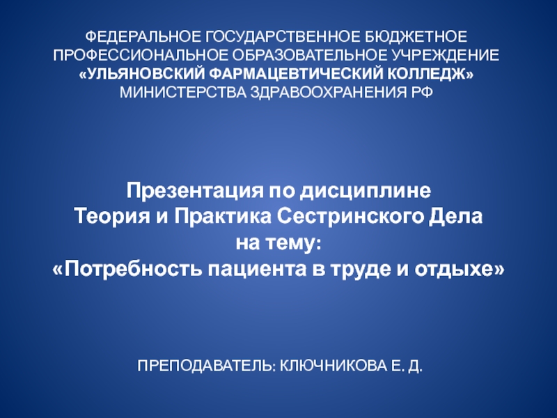 Презентация по дисциплине Теория и Практика Сестринского Дела на тему: «Потребность пациента в труде и отдыхе»