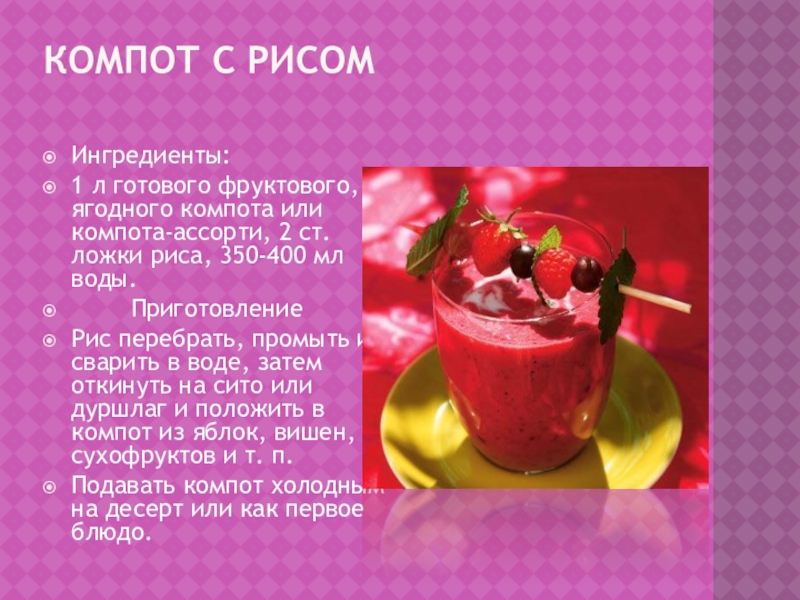 сиропе, концентрация которого зависит от степени сладости фруктов и ягод, в сироп можно добавлять мед, красное вино, цедру или пряности — корицу, гвоздику, ваниль. Время приготовления зависит от того, из каких фруктов и ягод варится компот, но диетологи не советуют слишком долго варить фрукты, чтобы максимально сохранить в них витамины. Перед употреблением напиток остужают.