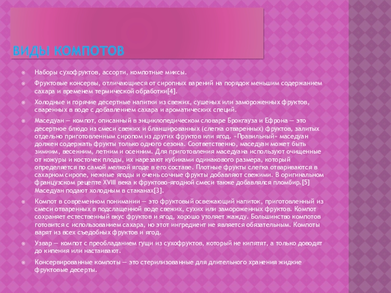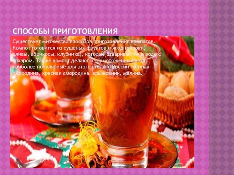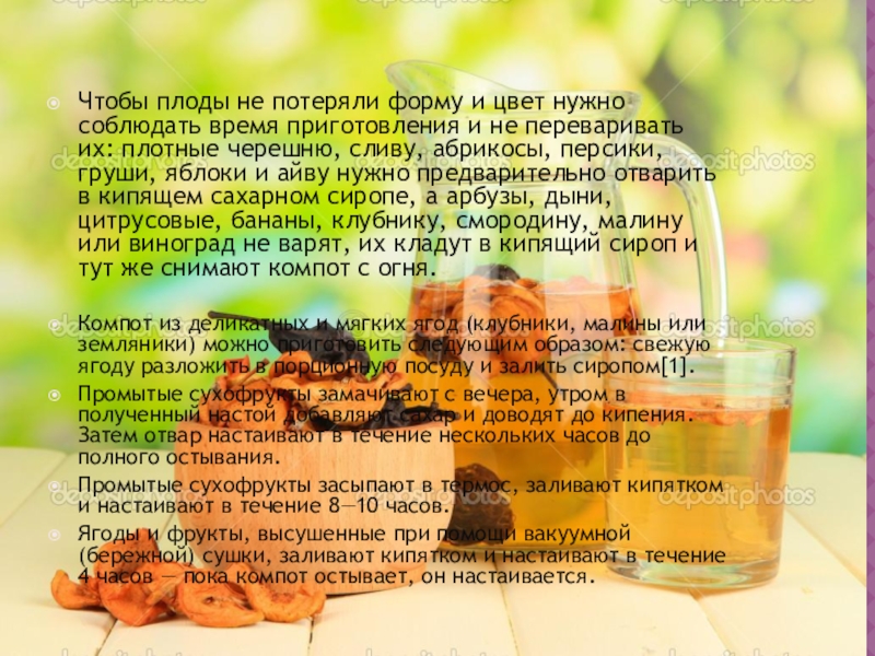 Существует множество способов приготовления компотов. Компот готовится из сушёных фруктов