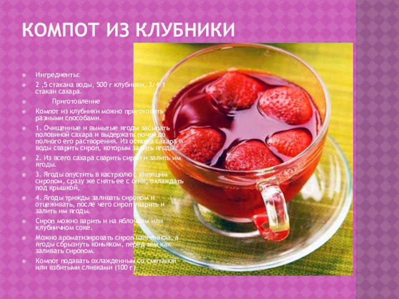 и ягод (яблоки, сливы, абрикосы, клубника), которые отвариваются в воде с сахаром. Также компот делают из замороженных ягод, наиболее популярные для этого ягоды в России: чёрная смородина, красная смородина, крыжовник, малина.