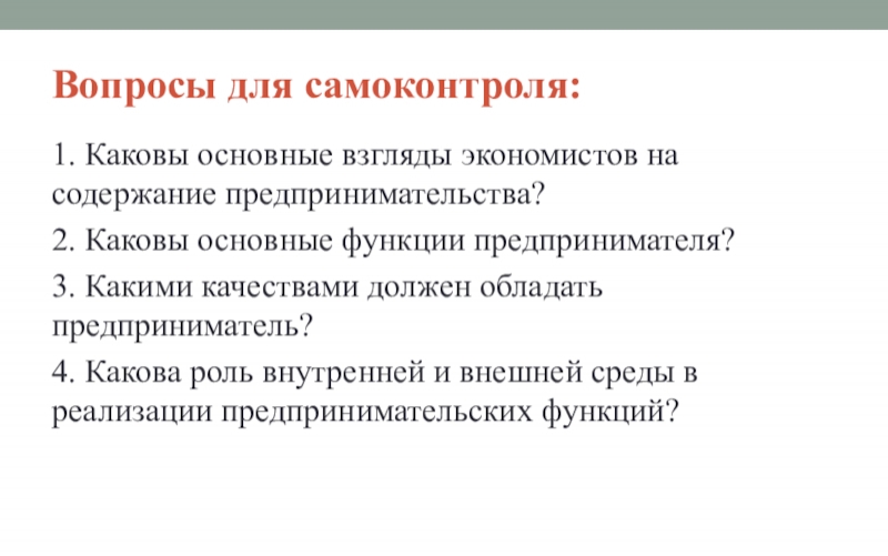 Вопросы для самоконтроля:1. Каковы основные взгляды экономистов на содержание предпринимательства?2. Каковы основные функции предпринимателя?3. Какими качествами должен