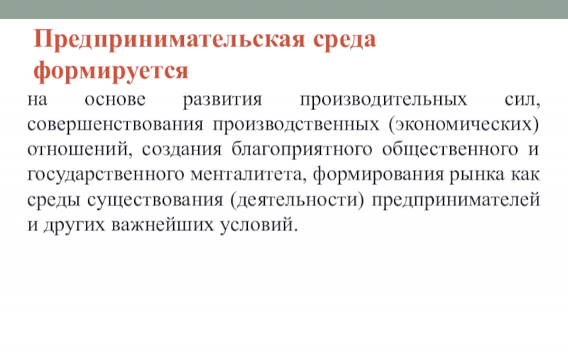 Предпринимательская среда формируется на основе развития производительных сил, совершенствования производственных (экономических) отношений, создания благоприятного общественного и государственного