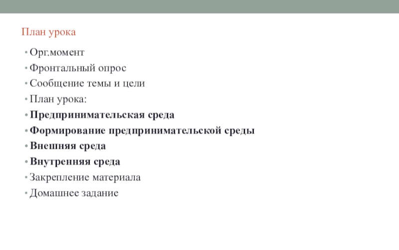 План урокаОрг.моментФронтальный опросСообщение темы и целиПлан урока:Предпринимательская средаФормирование предпринимательской средыВнешняя средаВнутренняя среда Закрепление материалаДомашнее задание