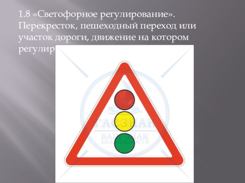 Слайд 111.8 «Светофорное регулирование». Перекресток, пешеходный переход или участок дороги, движение на