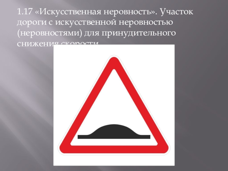 Слайд 201.17 «Искусственная неровность». Участок дороги с искусственной неровностью (неровностями) для принудительного