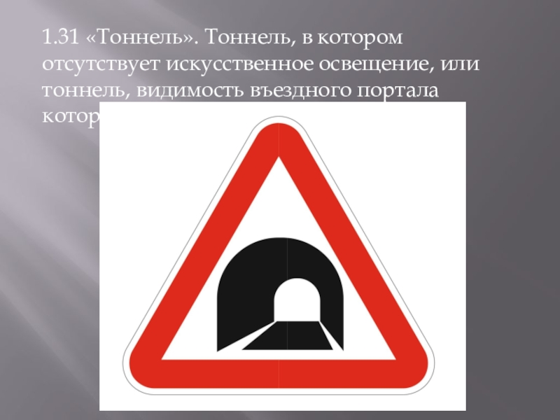 Слайд 341.31 «Тоннель». Тоннель, в котором отсутствует искусственное освещение, или тоннель, видимость