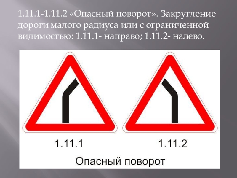 Слайд 141.11.1-1.11.2 «Опасный поворот». Закругление дороги малого радиуса или с ограниченной видимостью: