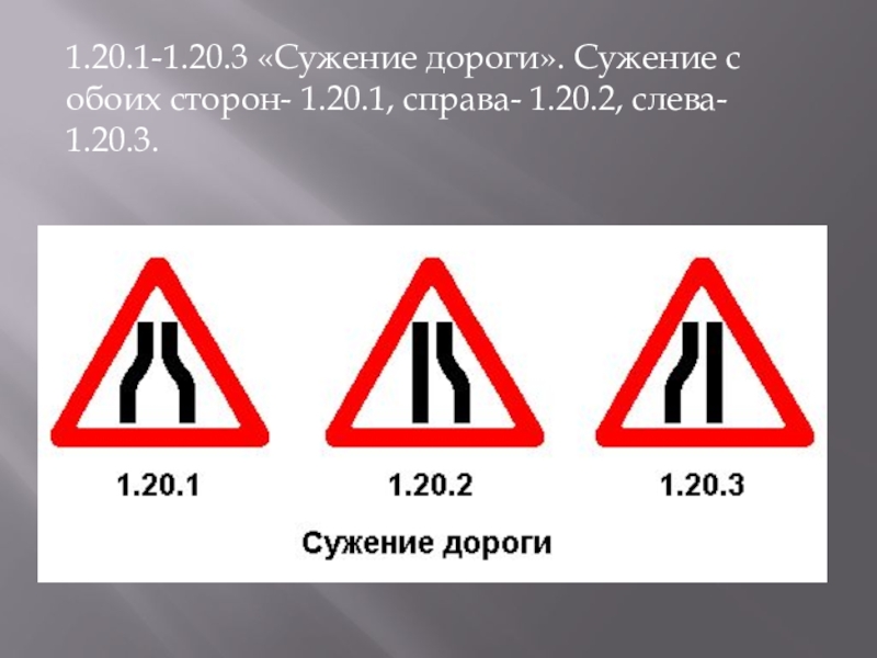 Слайд 231.20.1-1.20.3 «Сужение дороги». Сужение с обоих сторон- 1.20.1, справа- 1.20.2, слева-