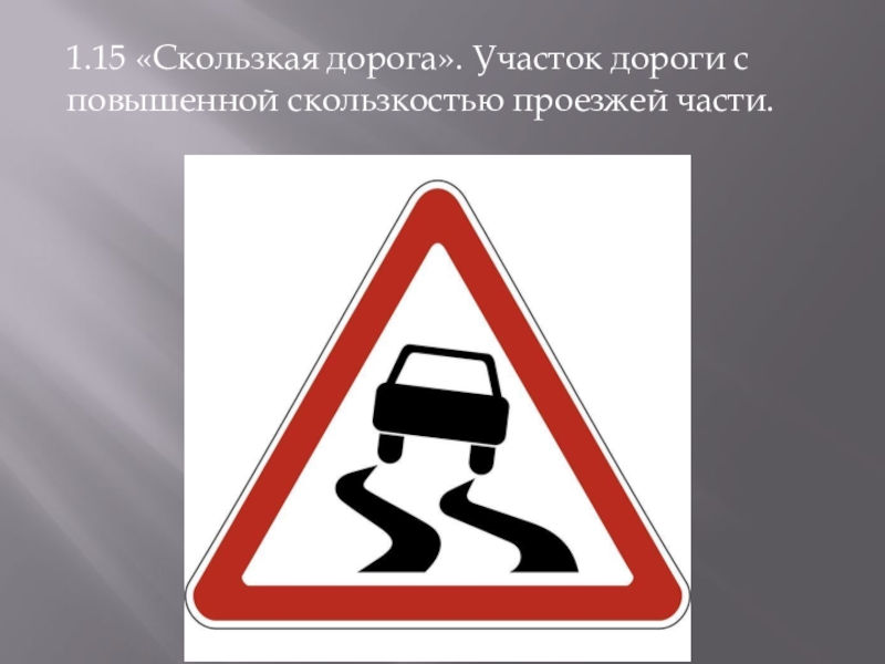 Слайд 181.15 «Скользкая дорога». Участок дороги с повышенной скользкостью проезжей части.